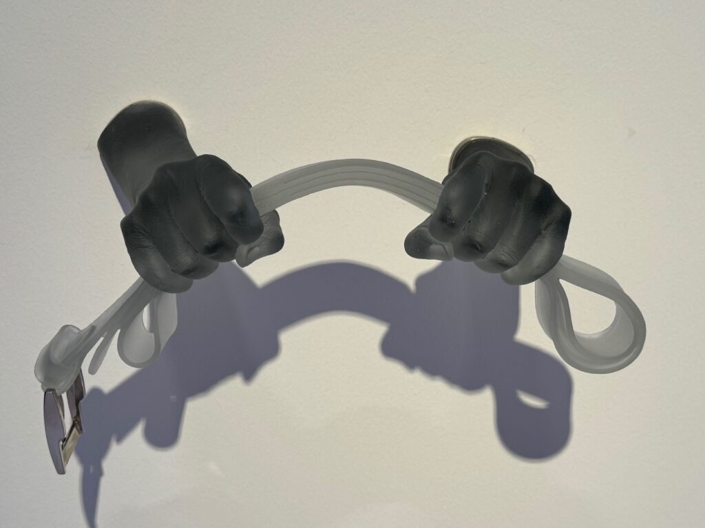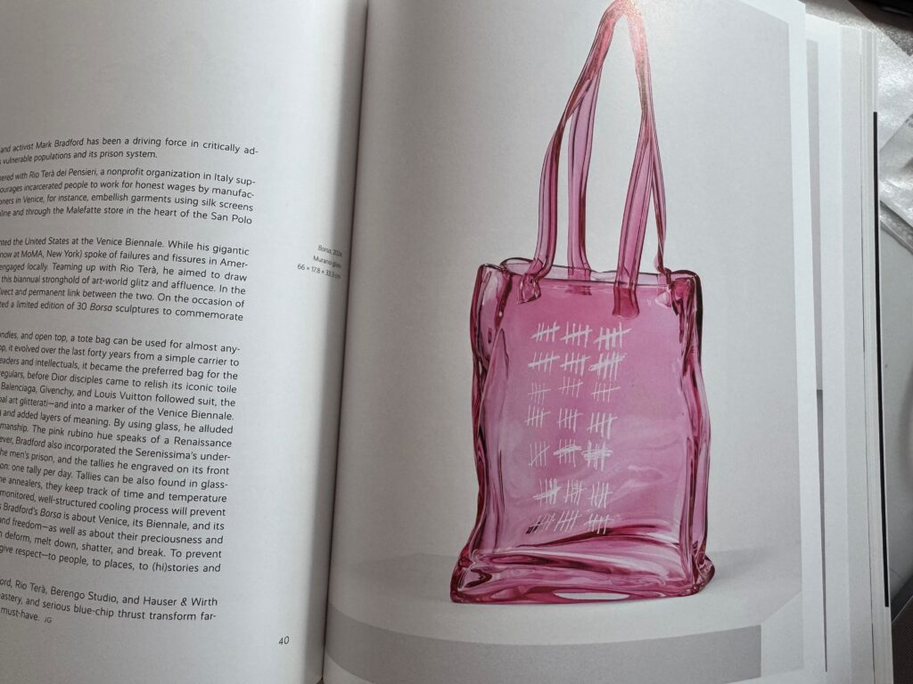 Ganz anders ist die Annäherung von Mark Bradford an das Material Glas. Der Kalifornier hat die Tradition der venezianischen Glasbläserei mit einem sozialen Engagement verbunden. Bei Bradford ist es Glas aus Murano, während in einem venezianischen Gefängnis diese Taschen aus PVC hergestellt werden. Die eingravierten Striche zeigen die Dauer der Inhaftierung an.