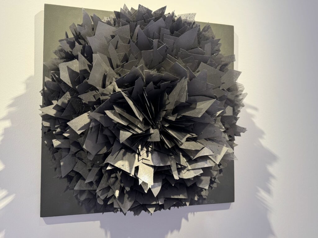 Die Künstlerin verwendet sehr feines Display – Glas, das als geformte Scherben perspektivisch geschichtet und angeordnet wurde. Es ist ein Spiel mit dem Licht und dem Blickwinkel.