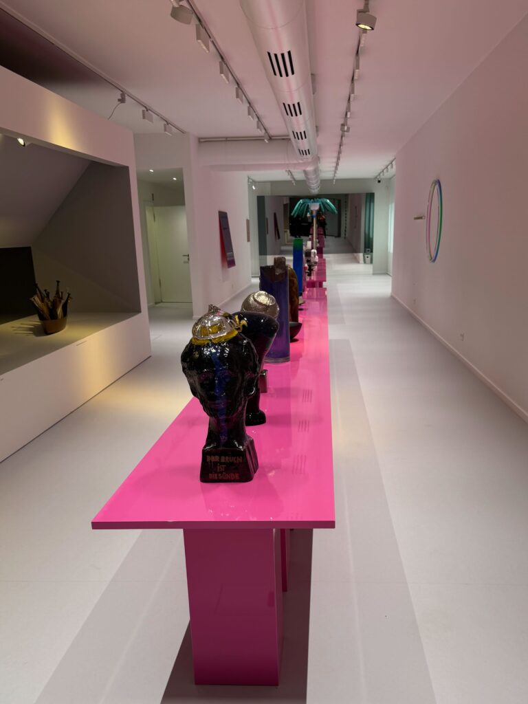 Die Ausstellungsräume sind auf zwei Ebenen, im Erdgeschoß der Black Box überwiegen Schwarz und Silber während die erste Etage vor Farbe explodieren möchte. Ein schmaler magentafarbener Tisch scheint bis zum Horizont zu führen.