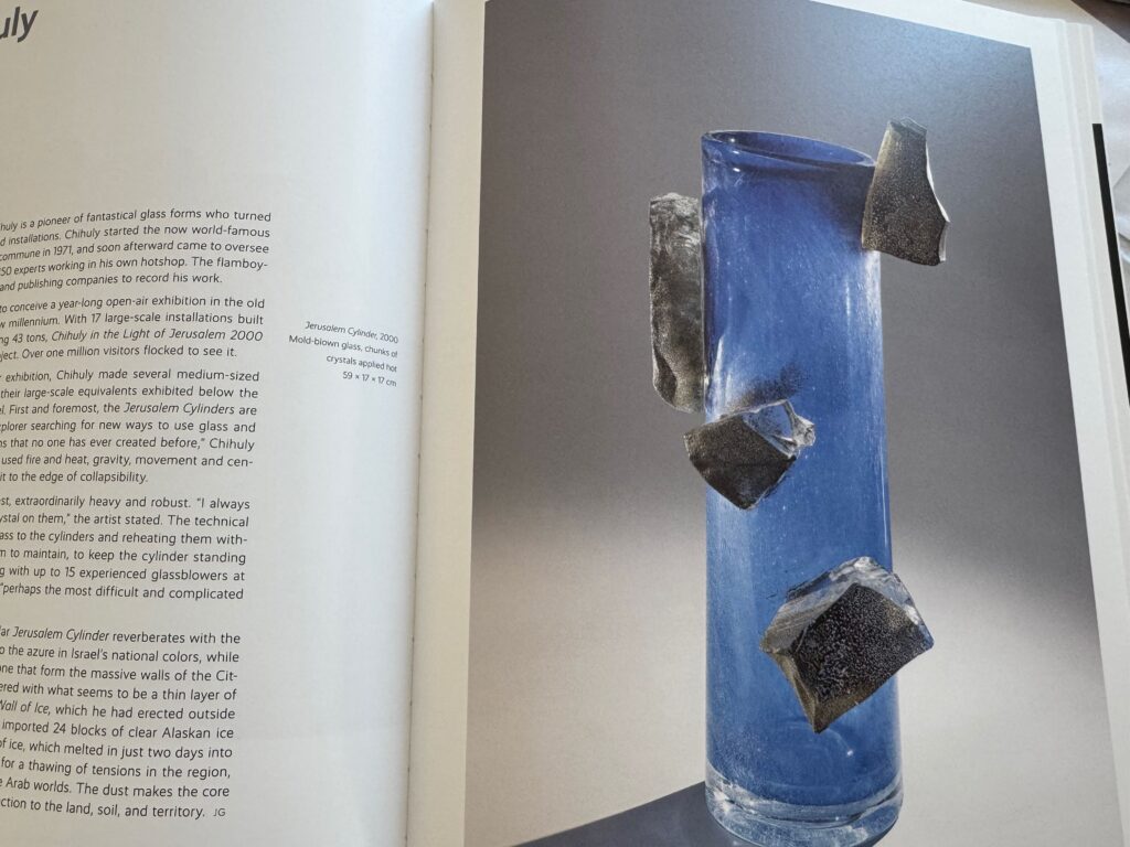 Dale Chihuly aus dem Nordwesten der USA ist aktuell der wohl bekannteste Glaskünstler weltweit. Er ist der Mitgründer der Pilchuck School, dem Aushängeschild für Glaskunst in den USA. Höchst ungewöhnliche Objekte sind sein Aushängeschild, die oftmals an die Grenzen des Machbaren stoßen. Wie Ende der 1990er Jahre als Chihuly nach Jerusalem eingeladen wurde und ein Jahr in der Zitadelle ausstellen konnte. Dafür entstand sein größtes Projekt, jene Zylinder von Mund geblasen, verziert mit massiven Stücken von Kristall.