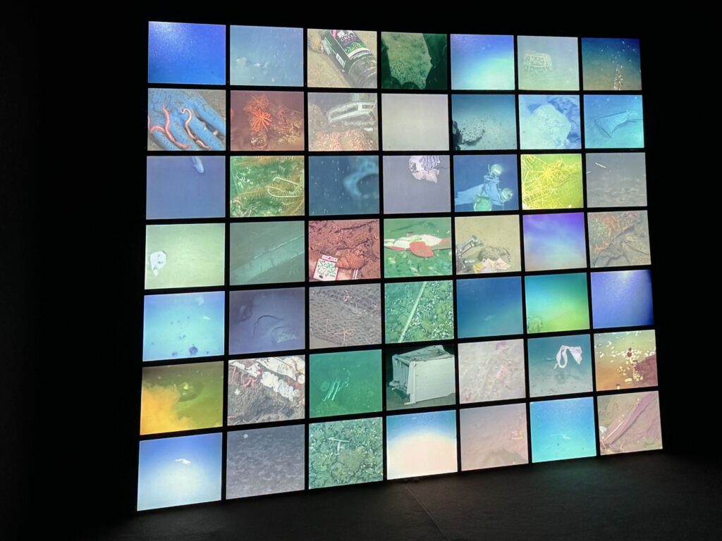 Es ist ein Mosaik aus 49 Einzelvideos und zwingt den Betrachter zu einem intensiven Studium. 2109 filmte Julian Charrière den Boden in der Tiefsee und zeigt uns unsere Hinterlassenschaften. Als unnütz weggeworfen kann unser Zivilisationsmüll kann er Meerestieren als neues Zuhause dienen.