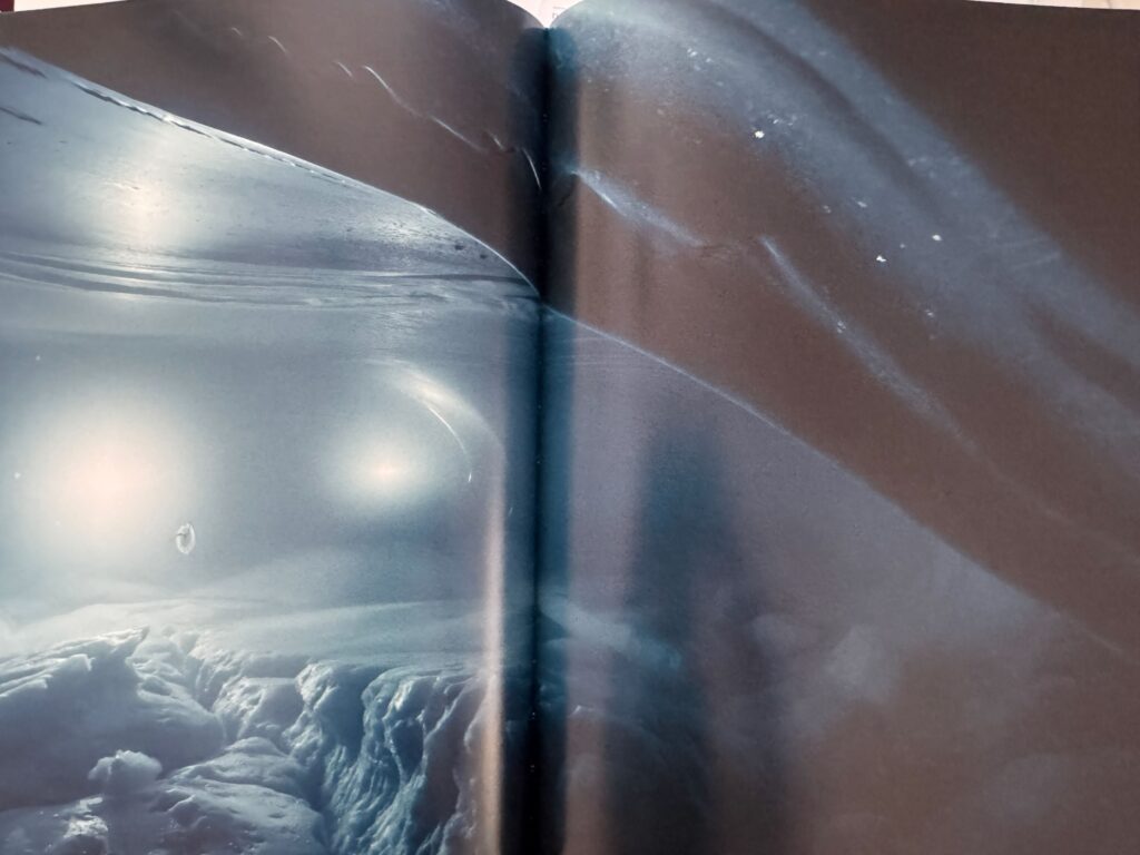 Den Abschluss der Ausstellung bildet Albedo, 2025 in den arktischen Gewässern von Grönland gefilmt. Im Mittelpunkt stehen schmelzende Eisberge und Gletscher. Für den Besucher wurde die Welt umgedreht, denn das Video hängt an der Decke und bequeme Kissen laden zum Hinlegen. Als Geräusche hört man die Gesänge der Wale.