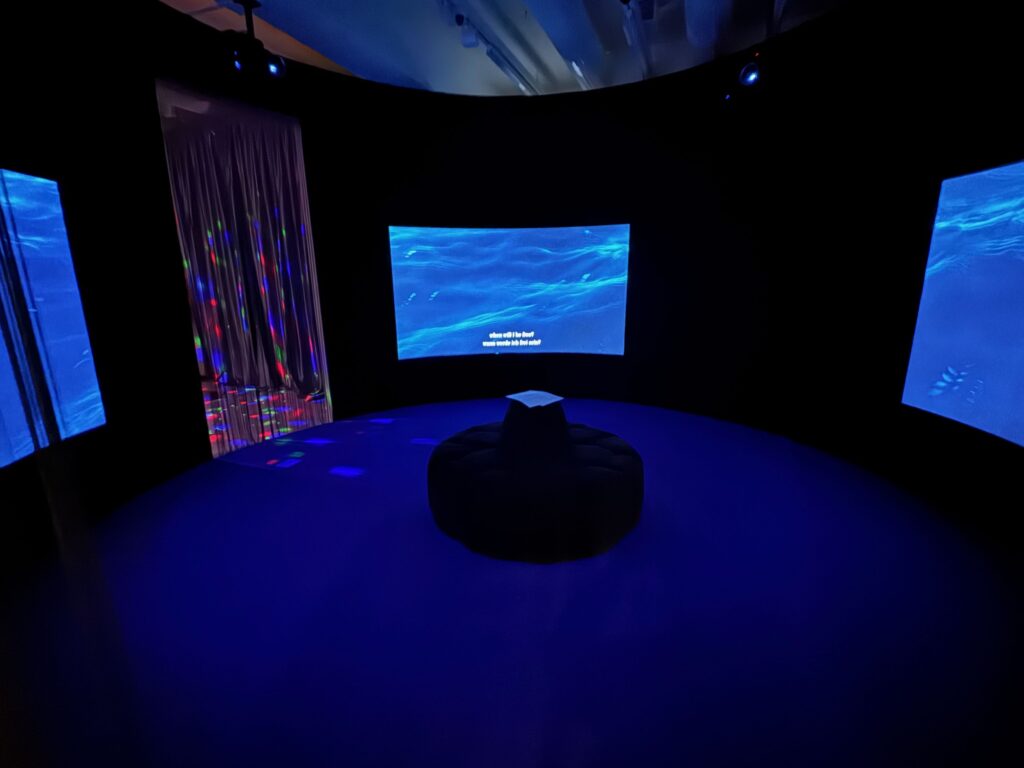 Eine Architektur mit Teppichboden, weichen Kissen, Fadenvorhängen und viel blaues Licht empfängt den Besucher, besser kann man sich nicht auf die Arbeiten der Künstlerin einstimmen. Besonders der zentrale Raum mit der 3-Kanal Videoinstallation, wo der Besucher auf einer Bank Platz nimmt, aber sich drehen muss, um den beiden anderen Videos zu folgen.