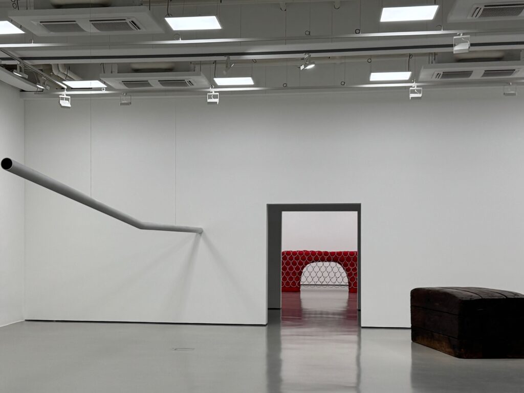 An zwei Metallbändern befestigt, hängt das Aluminiumrohr von der Decke. In der Mitte eine Winkelung um 5 Grad, das schräge Ende schwebt in der Lift. Im nächsten Raum wurde Untitled aus dem Jahr 2009 aufgebaut. Ein Gitterzaun aus silberfarbigen Metall schirmt ein Brückenteil ab, hergestellt aus rotem Fiberglas mit einer eigenwillig samtigen Oberfläche.