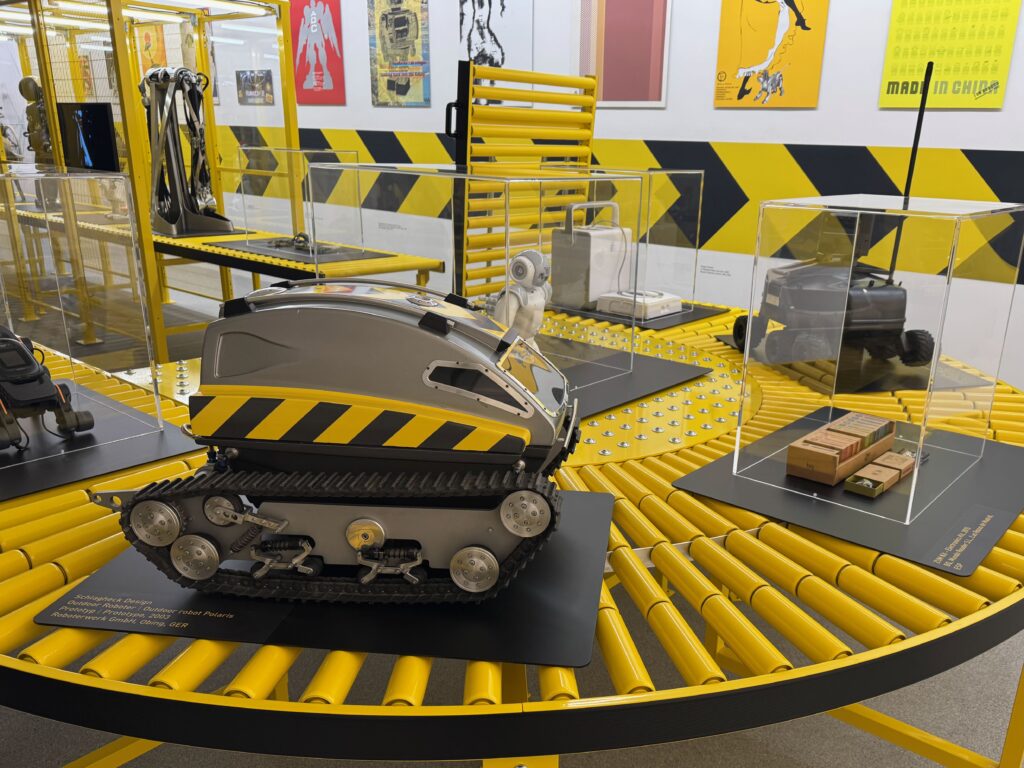Da die Mehrheit der Roboter aktuell in der Industrie genutzt werden, wird für die Ausstellung ein typisches Umfeld mit Rollbändern, Absperrungsbändern und engen Gittern gewählt.